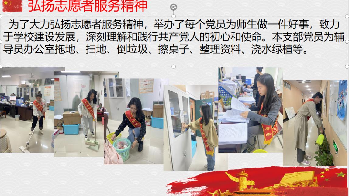 其次,重温学校历史以及展望学校未来发展。学习校训,弘扬“至善精神”,学院学生党支部进一步深入学习领会新时代青年的任务和目标,积极发挥党员先锋作用,开展党员为师生做一件好事其中有为老师打扫办公室的、有为学校图书馆捐赠书籍的、为老师办公室浇花的、有为老师整理材料的、还有为老师办公室积灰角落清洁的,扎实推进新时代校园师生文化建设,共同营造为群众办实事的氛围,发挥党员志愿服务的精神。