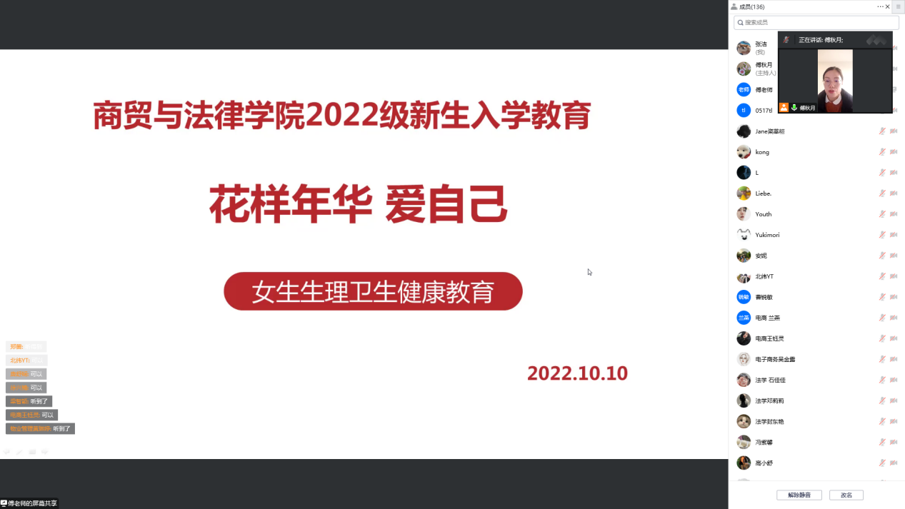 10月10日上午,由于疫情防控原因,商贸与法律学院在腾讯会议线上举行新生入学教育系列讲座之《女生生理卫生健康教育》讲座。讲座由商贸与法律学院傅秋月老师主讲,商贸与法律学院全体2022级女生参加本次讲座。