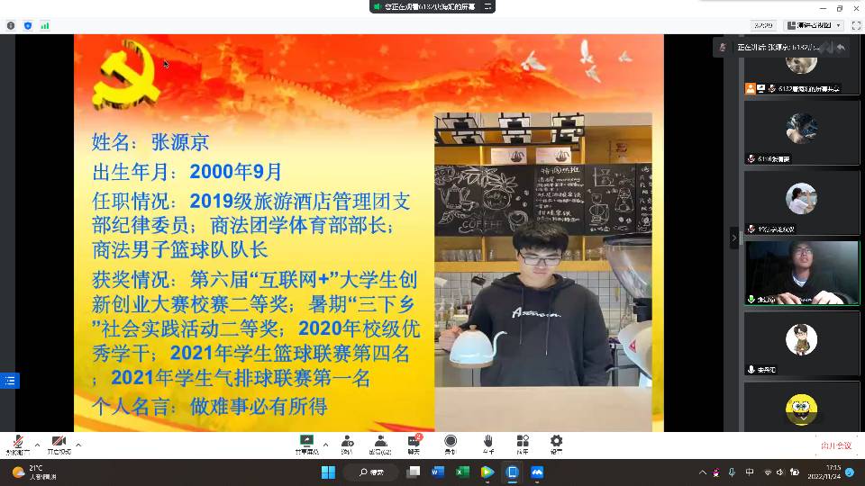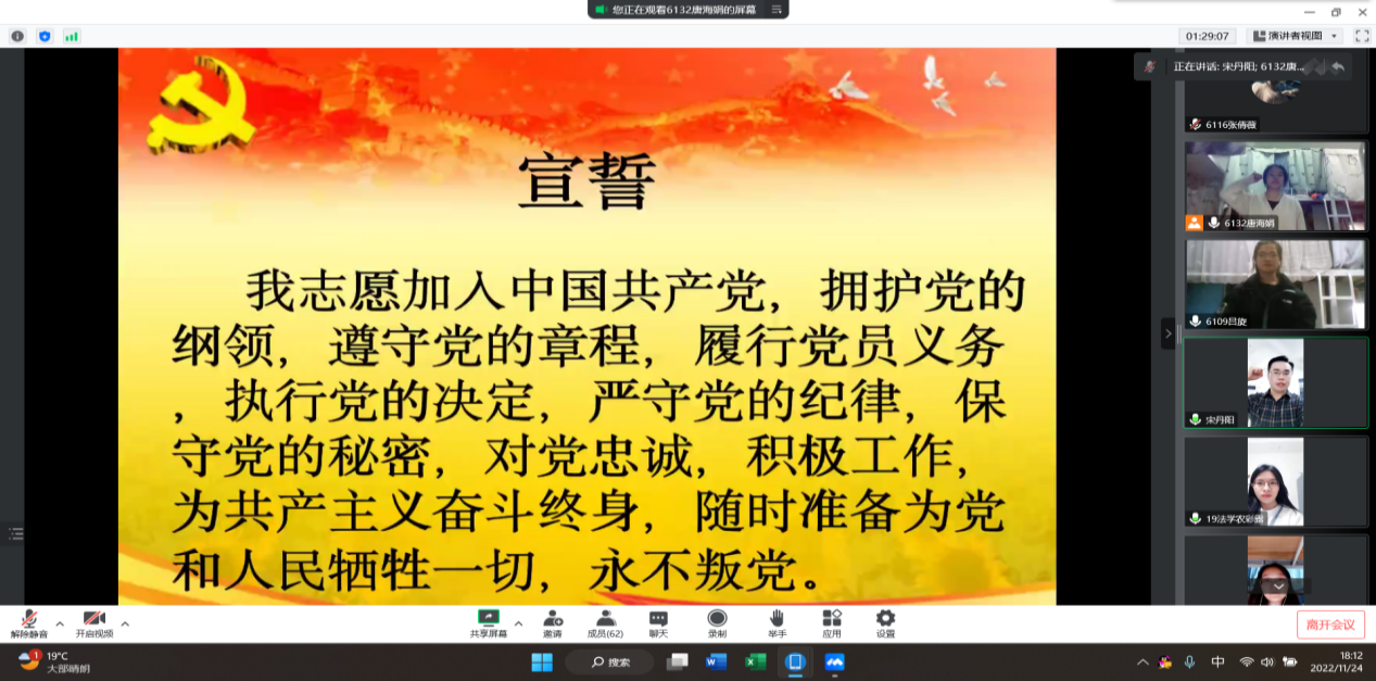 为进一步夯实我院党建工作,加强党员队伍建设,落实党支部发展党员工作计划,商贸与法律学院学生党支部于11月24日下午在腾讯会议开展了2022年下半年发展党员大会。会议由唐海娟同志主持,并邀请了商贸与法律学院党总支副书记刘雪、学生党支部书记宋丹阳、辅导员傅秋月以及学生党支部全体党员、预备党员同志参加会议。