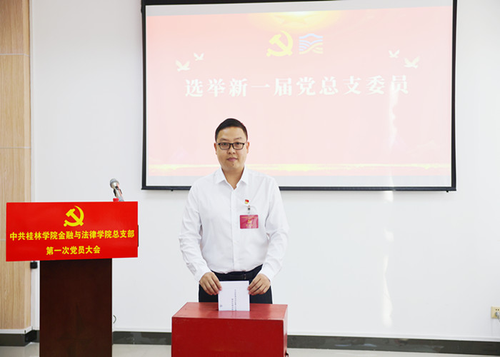 大会根据《中国共产党章程》《中国共产党基层组织选举工作条例》以及与会党员审议通过的《中共桂林学院金融与法律学院总支部委员会党员大会选举办法(草案)》等有关规定,坚持公平、公正、公开的原则,以无记名投票方式差额选举产生了陈俊杰等5名同志为金融与法律学院党总支部新一届委员。之后,陈俊杰代表新一届党总支委员作表态发言。他对与会党员对本届党总支部支委委员的信任和支持表示感谢,表示未来将继续从“加强学习,不断提高政治能力”“团结协作,不断提高班子凝聚力”“落实责任,不断提升党建工作水平”“坚守初心,不断巩固廉政风险防线”四个方面全力以赴地抓好各项工作,不辜负学校党委的重托和同志们的期望。