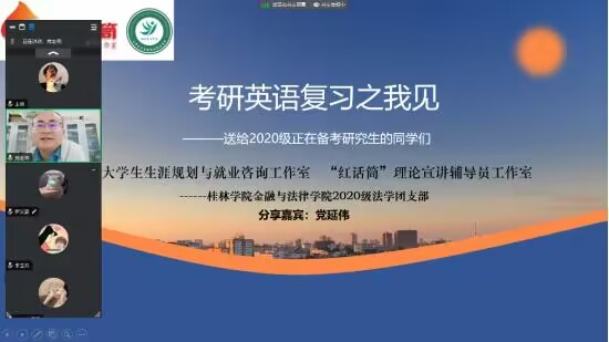 为进一步提高同学们考研复习效率,提高金融与法律学院考研的通过率,金融与法律学院杉湖家苑“一站式”学生社区党支部书记、团总支副书记、2020级法学专业辅导员党延伟老师,原广西师范大学法学院2016届法学专业硕士研究生、金融与法律学院学生社区党支部副书记、2023级金融学类专业辅导员赵曦老师,于10月22日晚面向2020级法学专业学生召开线上考研经验分享会。