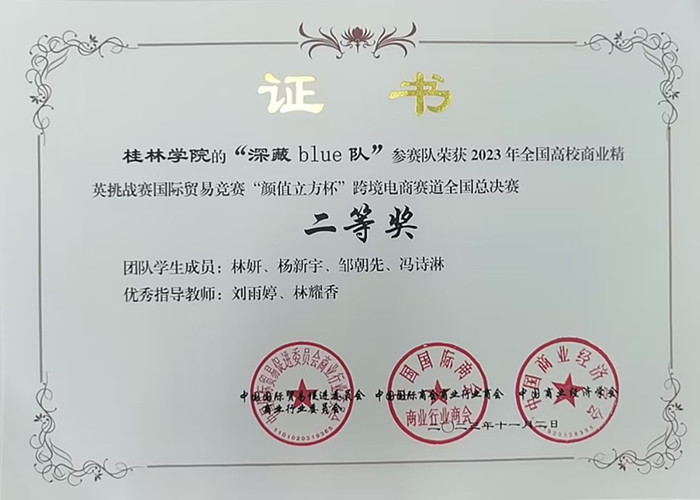 近日,金融与法律学院2021级国际经济与贸易专业学生林妍作为队长,带领团队获得2023年全国高校商业精英挑战赛国际贸易竞赛“颜值立方杯”跨境电商赛道全国总决赛二等奖。团队指导老师为刘雨婷、林耀香。