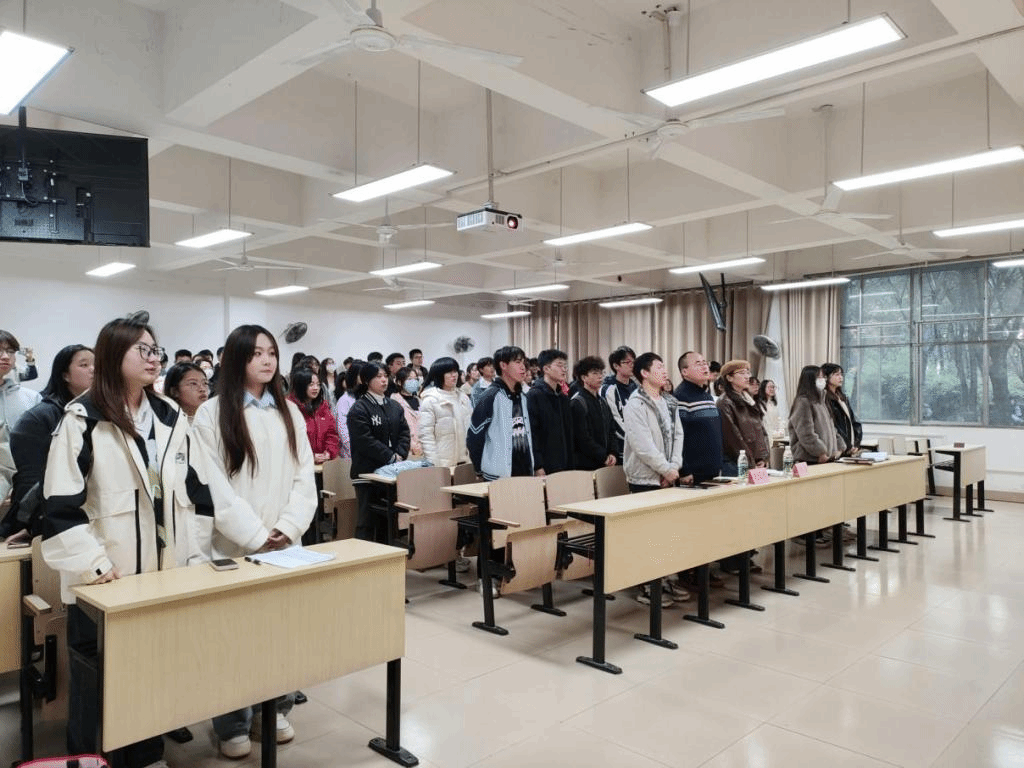 伴随着热烈的掌声,团学期末总结大会正式开始,全体成员起立齐唱共青团团歌《光荣啊,中国共青团》。