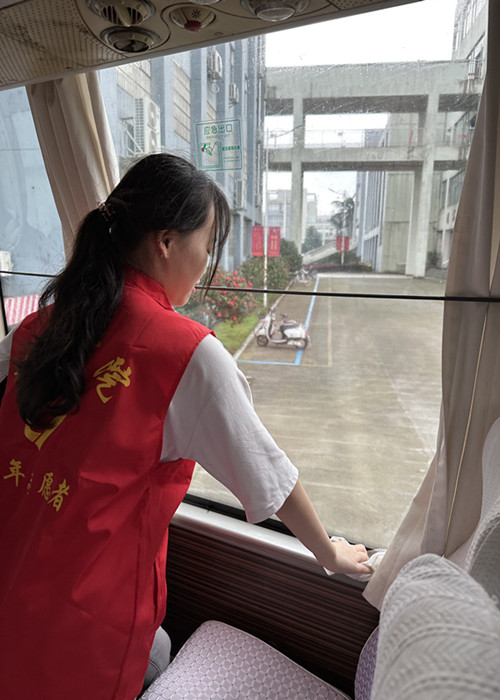 活动现场,志愿者们准备好活动所需的扫帚、拖把、抹布等清扫工具,配合默契,干劲十足,拿起拖把、抹布,认真擦拭车身、车内的座位、行李架等,不留下一个污点,不放过一个死角,力争为老师们提供一个舒适干净的乘车环境。经志愿者的辛勤劳动,校车焕然一新。志愿者的表现得到了校车师傅和老师们的一致好评。