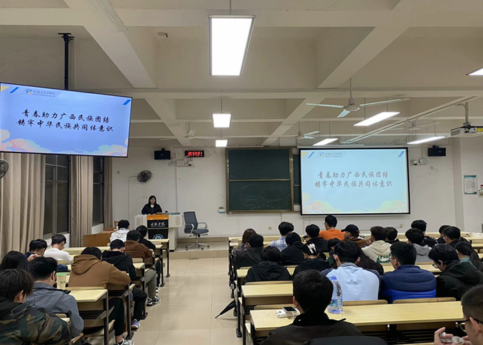 班会上,姚荣副书记向同学们详细介绍了铸牢中华民族共同体意识的重大意义、铸牢中华民族共同体意识的丰富内涵和铸牢中华民族共同体意识的实践途径;党延伟老师带领同学们集体学习习近平总书记在广西考察时的重要讲话,结合自身实际经历,深入浅出讲解中华民族共同体概念的提出与发展、铸牢中华民族共同体意识的重大意义,深刻阐述增强“五个认同”的重要意义;余晓丽老师从广西三月三深厚的文化底蕴切入,引出“民族”“中华民族”等基本概念,重点围绕铸牢中华民族共同体意识理论脉络、铸牢中华民族共同体意识的基本要求和中华民族多元一体格局三个方面进行了讲解;谭海练老师则从自成一体的地理空间、“大一统”的政治文化传统、相互依赖的经济生活、互相吸纳的人口联系和互鉴融通的中华文化五个方面介绍中华民族共同体意识的形成与铸牢。
