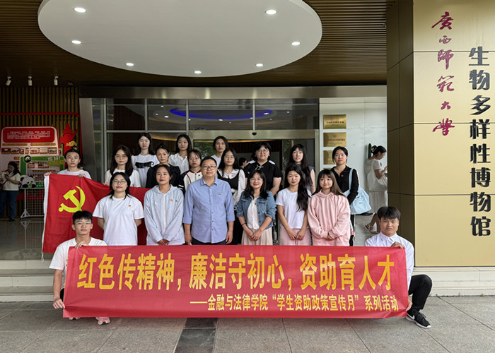 近期,金融与法律学院党总支副书记姚荣、辅导员余晓丽带领我院部分受奖助学生前往广西师范大学“植谱清风”廉洁文化教育基地参观学习。活动以“红色传精神,廉洁守初心,资助育人才”为主题,旨在加强我院受奖助学生的廉洁意识,同时鼓励学生努力成长为国家栋梁之材。
