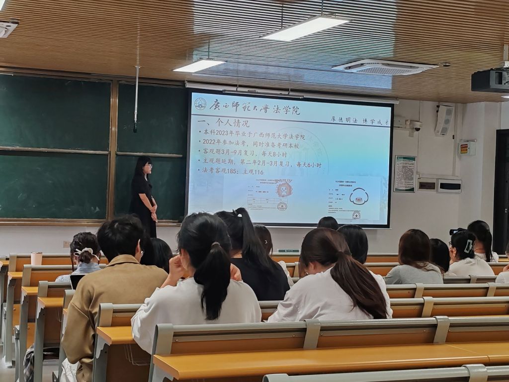 为深入贯彻“以学生为中心”的教学理念,6月1日,法学教研室在至善楼1214教室开展“司法考试经验分享会”活动,助力2024年度司法考试。本次活动由法学教研室黄维娜组织,主讲嘉宾包括广西师范大学法学院研究生曹雪婷、韩佳旭及我院法学专业2020级王绍清。