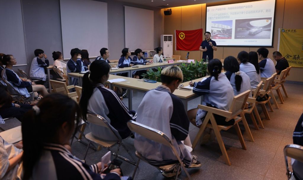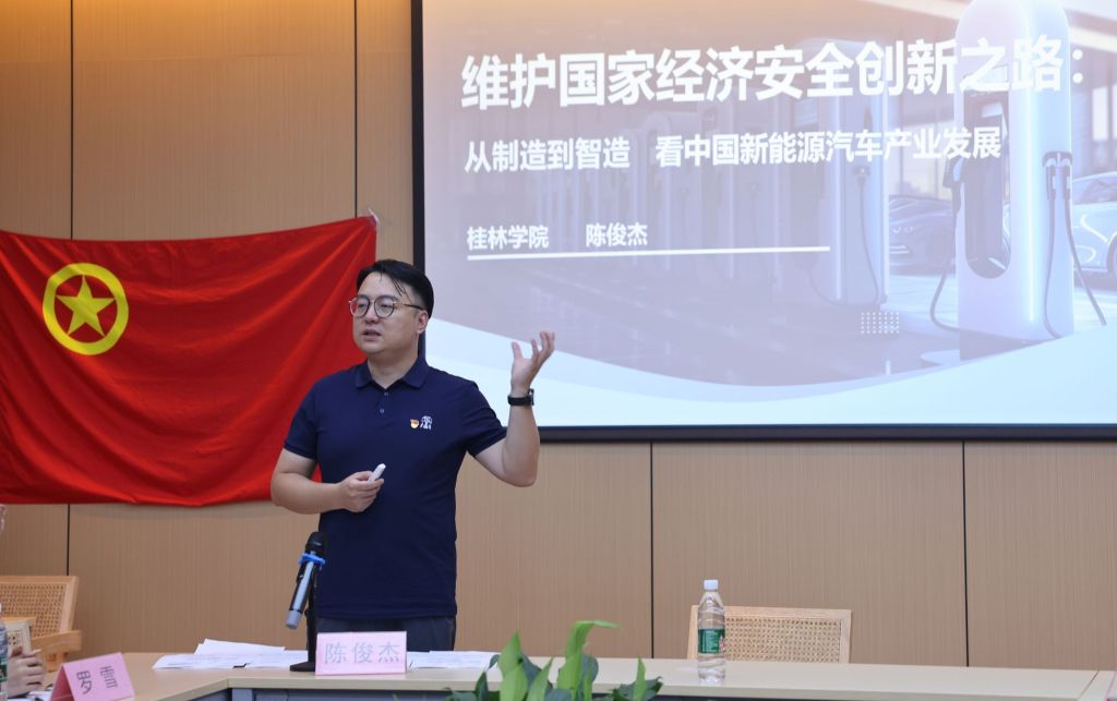 讲座伊始,陈俊杰书记抛出一个问题,提到“华为”这个品牌,你们能联想到什么?这个问题引起学生们的广泛思考。通过对这个问题的思考,陈俊杰引出了本次讲座的主题---从制造到智造:中国新能源汽车产业与国家经济安全的创新之路。陈俊杰告诉同学们安全是发展的前提,发展是安全的保障,统筹发展和安全,增强忧患意识,做到居安思危,是我们党治国理政的一个重大原则。随后,他从全球视角下的新能源汽车产业、中美经济安全技术博弈、国际竞争中的经济安全策略三个方面深刻阐述了中国新能源汽车产业与国家经济安全的创新之路。授课期间,同学们专注听讲,积极分享自己关于此话题的见解。