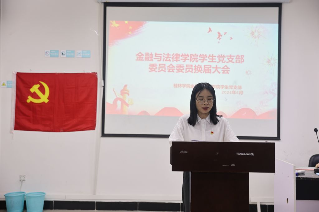 随后,上一届党支部组织委员朱敏敏同志宣读《选举办法》。参会党员举手表决,一致通过《选举办法》。根据选举办法规定,大会表决通过监票人、计票人。余晓丽同志宣读了桂林学院金融与法律学院学生党支部委员会名额和候选人简历。大会严格按照党章规定的选举办法和选举制度,坚持公平、公正、公开的原则,以无记名投票,差额选举的方式进行。最终,大会投票表决选出谭海练等3名同志为党支部新一届委员。之后,苏青代表新一届党支部委员作表态发言。她表示,新一届支部委员将不负重托,以更加饱满的热情和更加务实的作风,凝心聚力,推动学院党建工作再上新台阶。