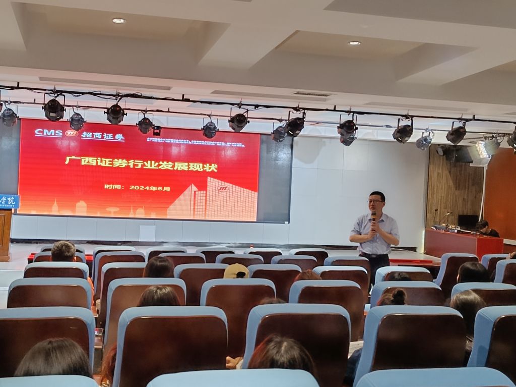 为了提高学生行业认知水平和投资保护意识,6月11日,招商证券桂林营业部来金融与法律学院为学生开展“广西金融前沿”系列讲座之广西证券行业发展报告。2021级、2022级金融学类学生参与了此次讲座。