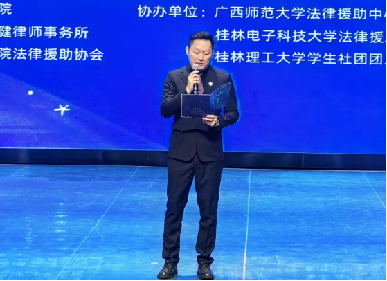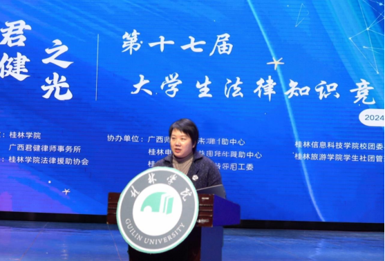在开幕式上,杨庆庆副校长回顾了桂林学院与广西君健律师事务所的长期合作,并表达了对未来合作的期待。强调,双方应探索更多元化、更深层次的合作模式,共同推动法学教育的创新发展,培养更多高素质的应用型法律人才。“君健之光”大学生法律知识竞赛不仅是普法、学法、用法的实践平台,更是法治精神的传承平台。通过竞赛,鼓励大学生成为社会主义法治的忠实崇尚者、自觉遵守者和坚定捍卫者。