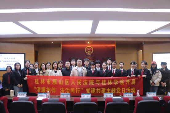 为深入贯彻落实习近平法治思想,在“12.9”国际反腐败日来临之际,在学校纪委的悉心指导下,12月6日,金融与法律学院与雁山法院隆重举办了以“清廉相伴,法治同行”为主题的“清廉桂院”建设“12·9”廉洁宣传教育活动。学校纪委书记康庚莲,雁山法院党组书记、副院长、代院长苏革,法院政治部主任廖婷,校团委书记、校纪委办公室主任、金融与法律学院领导班子、人文学院党总支书记、雁山法院法官代表及学院师生代表一百余人参加活动。