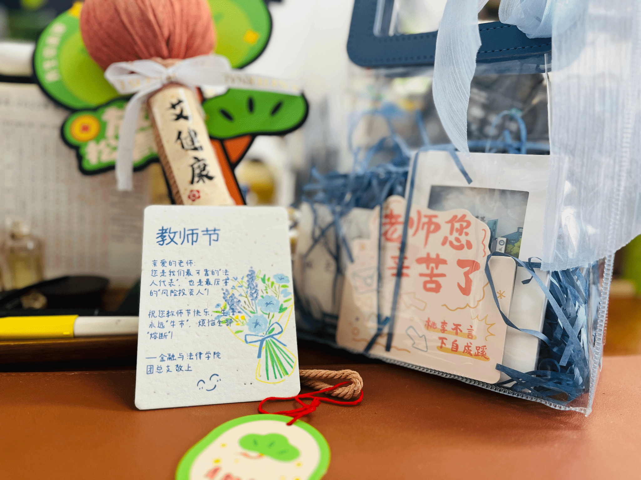 除种子贺卡外,团总支还送上了学生手工制作的“永生花束”。花束以丝带、卡纸、干花为材料,配色雅致、造型精巧,象征着老师传授的知识与智慧如同永不凋零的花朵,在学子心中生根发芽、馥郁芬芳。