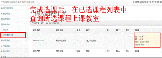 (五)完成选课后,在已选课程列表中查询所选课程上课教室。