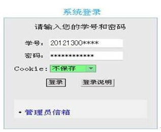 1.在系统登录的对话框中输入学号和密码,首次登录密码与学号相同。Cookie处请选择不保存。如图所示: