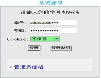 1.在系统登录的对话框中输入学号和密码,首次登录密码与学号相同。Cookie处请选择不保存。如图所示:
