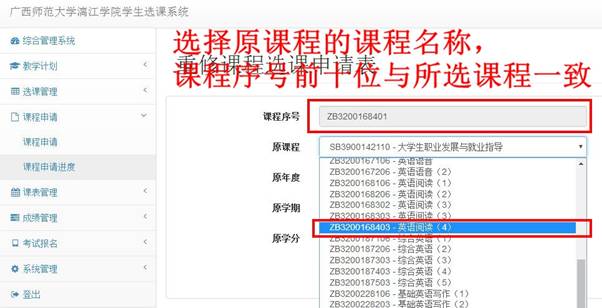 (五)在重新学习(含重考)课程选课申请表中,选择原课程的课程名称,课程序号前十位与所选课程一致;