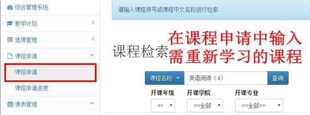 (三)在课程申请中输入需要重新学习(含重考)的课程,输入课程后点查询;(若查询无数据,说明该课程在本学期没有开课)