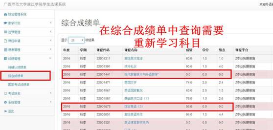 (二)在综合成绩单中查询需要重新学习(含重考)科目;