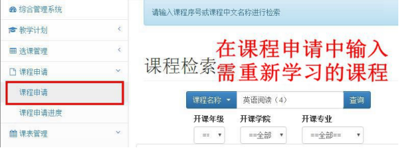 (三)在课程申请中输入需要重新学习(含重考)的课程,输入课程后点查询;(若查询无数据,说明该课程在本学期没有开课)