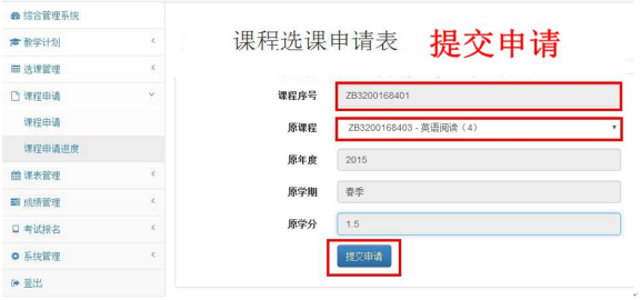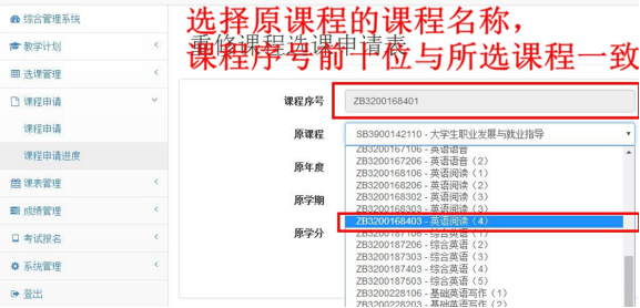 (五)在重新学习(含重考)课程选课申请表中,选择原课程的课程名称,课程序号前十位与所选课程一致;