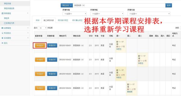 (四)根据课程安排表选择重新学习(含重考)的课程;