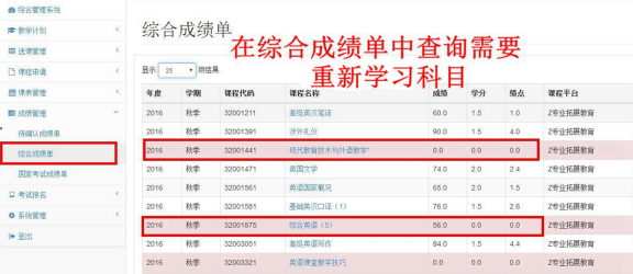 (二) 在综合成绩单中查询需要重新学习(含重考)科目;