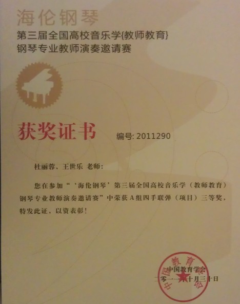 全国高校音乐学(教师教育)钢琴专业教师演奏邀请赛是全国高师钢琴专业教师演奏比赛的最高级别,参赛者来自全国112所高校的300余名参赛选手,今年的赛况比往届更为激烈,参赛曲目也更为丰富,整体水平较往届都有大幅度的提高,演奏形式更加丰富,有独奏组、双钢琴组、四手联弹组、即兴伴奏组等。我院音乐与教育系钢琴教研室杜丽蓉、王世乐两位老师在这次邀请赛上发挥正常,表现出了应有的水平,得到了评委们的肯定,两位教师合作的四手联弹荣获三等奖。