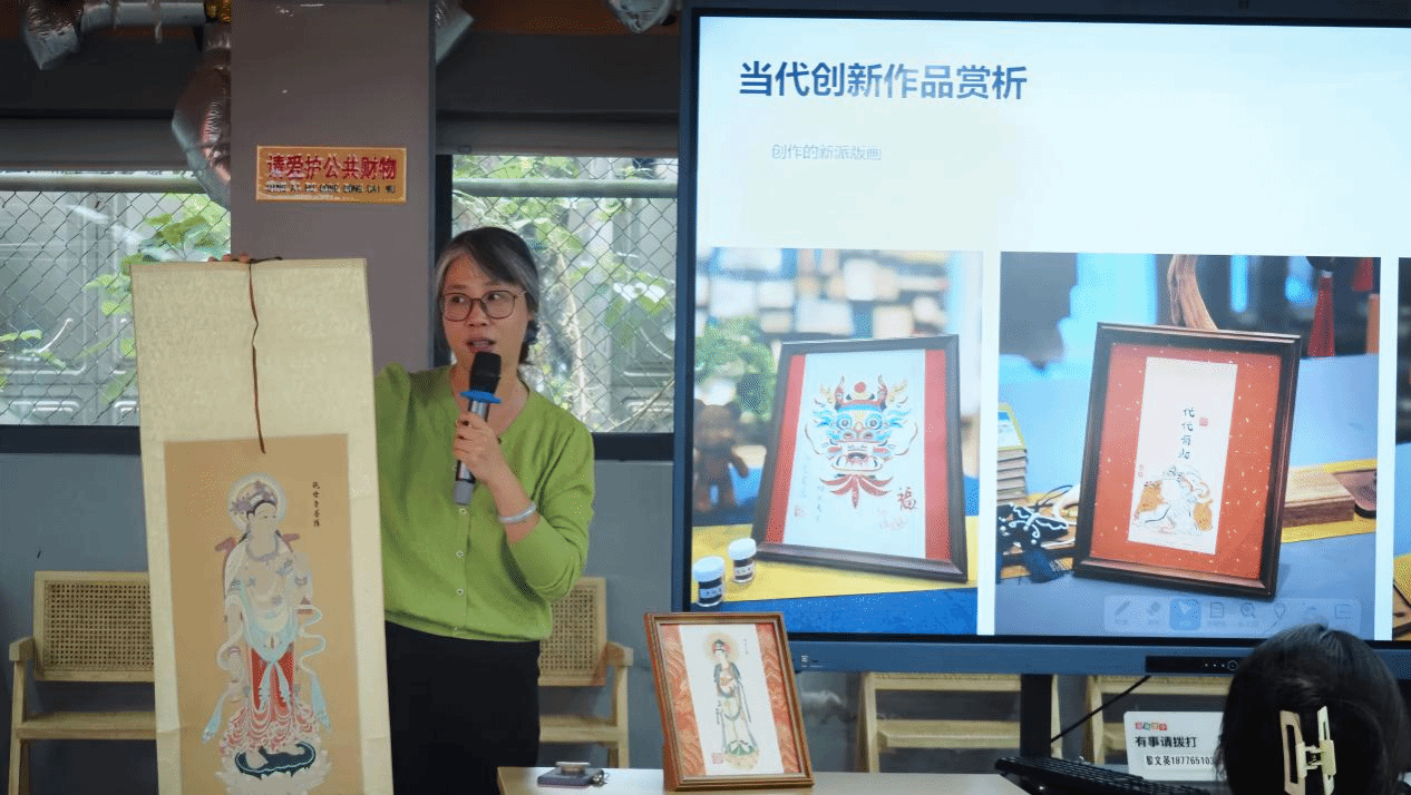 活动现场,陈永斓首先为同学们简要介绍了桂林雕版彩色套印技艺的相关知识。她提到,这门技艺可追溯至明朝末年,依托棠梓巷木匠文化的深厚根基、桂垣书局的推动以及抗战时期“文化城”的滋养,逐渐形成了集绘画、雕刻与印刷于一体、兼具古典韵味的独特工艺体系。作为从事该技艺传承10余年的传承人,陈永斓还分享了自己以现代审美视角创新雕版艺术表现形式的经验,以及其非遗站采用“政府主导、企业参与、项目支持、市场运营、集体宣传、多方共赢”模式的实践,让同学们快速对这门非遗技艺建立起基础认知。