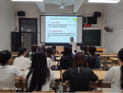 11月1日,人文学院在1302教室举行2023年全国高师学生英语教师职业技能竞赛培训指导讲座。多年负责本项赛事的欧炼芬老师主讲,全体参赛学生参加。