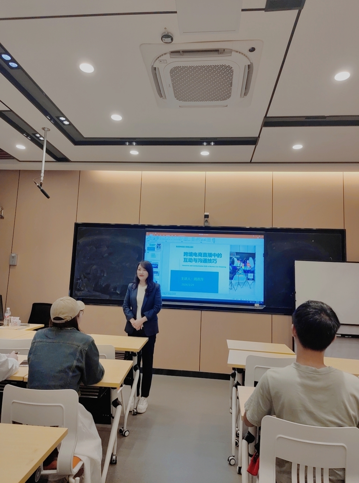 近日,人文学院商务英语专业骨干教师周燕萍为商务英语、国际贸易以及电子商务等专业学生带来了一场主题为“跨境电商直播中的互动与沟通技巧”的专题讲座。此次讲座旨在帮助学生深入了解跨境电商直播的发展现状、未来趋势及其在全球贸易中的重要作用,并引导学生积极参加国际贸易竞赛。