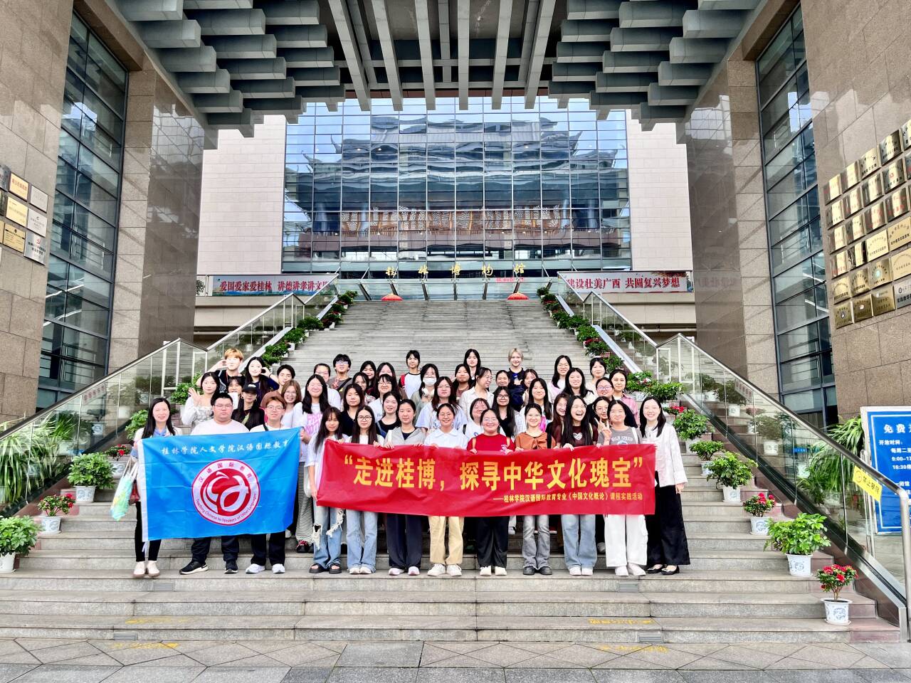 为更好地传播和弘扬中华文化,深化对中华文化的理解与实践,4月24日下午,人文学院语言学及国际中文教育教研室教师张佳敏、黄鹭组织2023级汉语国际教育专业全体学生参观桂林博物馆,开展了以“走进桂博,探寻中华文化瑰宝”为主题的《中国文化概况》课程实践活动。