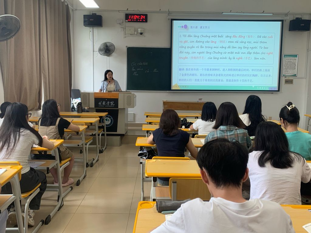 公开课分别由教研室主任阳琦兰和教师郑克晓主讲,内容为《Treo biển》和《Nón làng Chuông》,授课对象为2023级和2022级越南语专业学生。阳琦兰的泛读课上主要展示了实践性教学环节,指导学生对课文内容进行复述和演绎,让学生以灵活的方式掌握课程内容。郑克晓的基础课上主要通过理论讲授形式深入浅出地讲解,教学重难点突出。课上学生参与度高,教学效果良好。