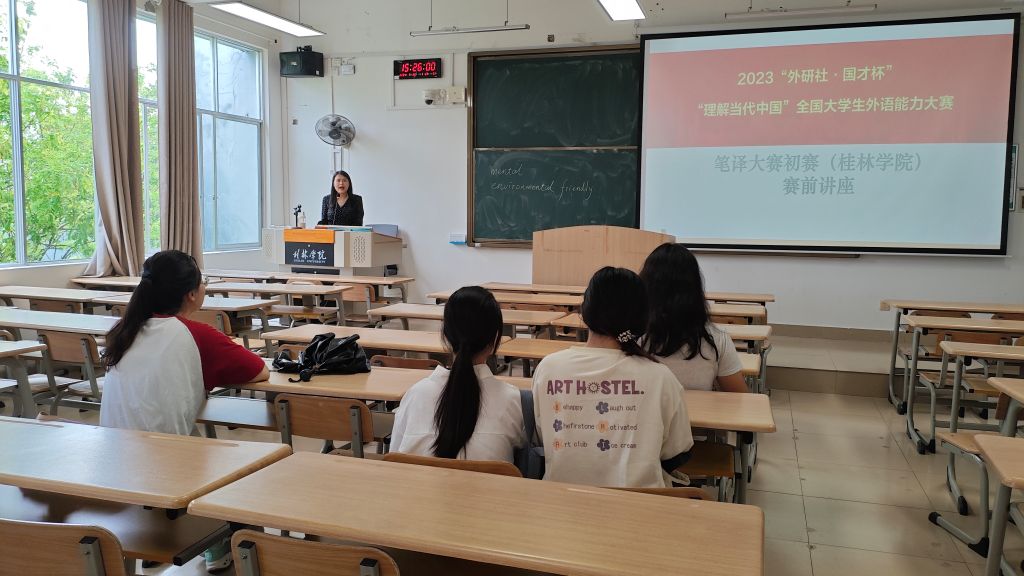 由学校教务与产教融合处和人文学院共同主办的2024“外研社•国才杯”“理解当代中国”全国大学生外语能力大赛桂林学院校赛正在积极筹备中,已有来自全校各专业360余名同学报名参加笔译赛项。为了帮助同学们做好赛前的相关准备,9月25日下午,人文学院教师梁晨在至善楼1312教室为参赛同学开展了一场赛前辅导讲座。