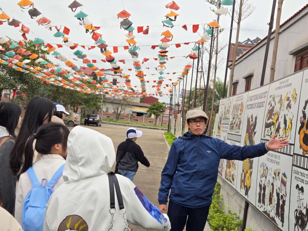 接着学生们参观东湖民间画作保护中心,范国史老师对东湖画给学生进行逐一讲解。东湖画起源于15世纪黎朝时期的北宁省东湖村,以天然颜料、手工造纸和雕版印刷技艺闻名,主题涵盖农耕生活、神话传说等。 师生们观看了木版印刷流程,并参观了馆藏的《炮洞之春》《夜间过河》等战时素描作品。