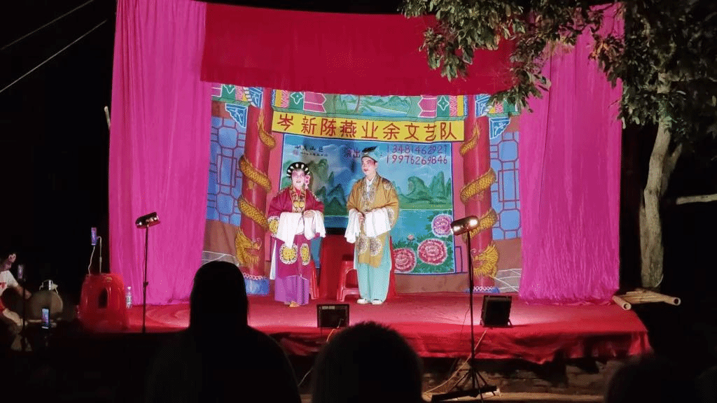 小组成员于8月29日晚19:30到达岑溪市六田村邓公庙演出现场后,开始观看由岑新陈燕业余文艺队带来的牛娘戏演出《龙凤宝塔》。该演出讲述了这样一个故事:男主人公想要上京赶考,但家中无钱赴考,便去寻求未来岳父帮助,可未来岳父不但不帮他反而要他给三百两银子,否则将断了他和女儿的婚约。不得已之下他只能去典当龙凤宝塔,却又被典当行老板用假银欺骗。男主人公的舅舅发现假银后让他停止婚约,出计让男主人公男扮女装当老板的小妾拿回龙凤宝塔。在这一过程中男主人公和老板的丫鬟互生情愫,丫鬟出钱帮助他上京赶考。最终男主人公考取功名,拿下状元,回到老家与家人团圆。