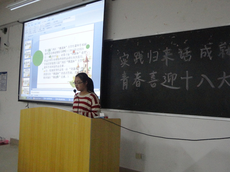 在本次交流会中,为了响应“挑战杯”广西大学生课外学术科技作品竞赛与大学生创业计划竞赛,首先,温海燕副书记介绍了关于我院“创新杯”的相关内容并具体介绍了活动类型,竞赛要求,以及报名、选题、申报等程序的具体开展要求。随后,她向同学们展示了外语系2012年暑期社会实践活动的相关内容,与同学们分享了实践活动中的趣闻趣事、实践经验,归纳总结了实践活动中的收获与不足,给同学们在实践活动中存在的问题提出了切实可行的建议和方法。