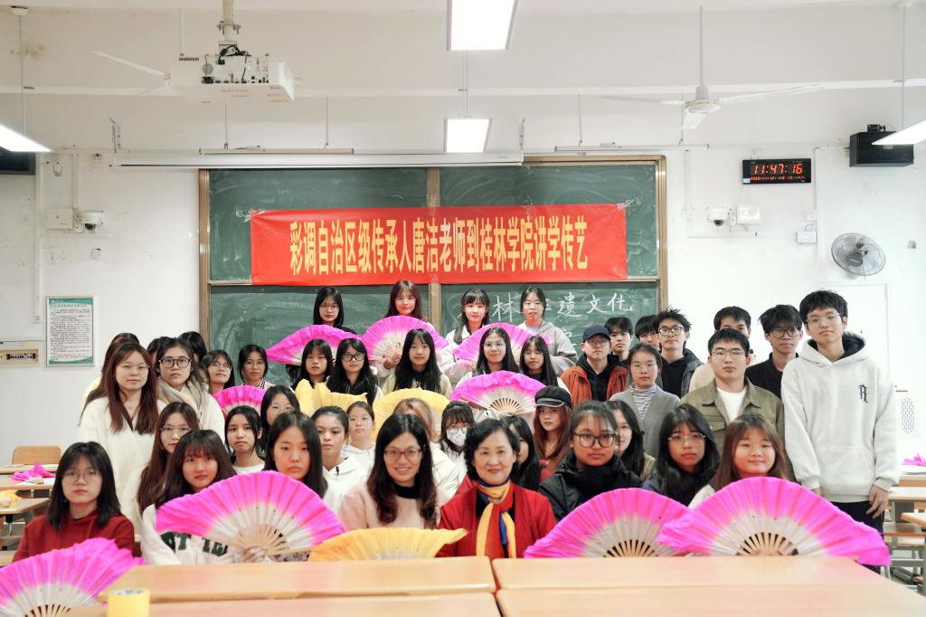 近日,依托《桂林非遗文化赏析与实践》特色课程和2023年国家级大学生创新创业项目“戏文次元,多维译丛——‘语料库+跨媒介’交互下非遗彩调台词的嬗变与探究”,商务英语专业教师赵莉莉和大创团队成员邀请彩调自治区级传承人唐洁进校讲学传艺,让同学们体验和感受彩调的魅力,更好地用英语讲好国家级非遗彩调的故事。