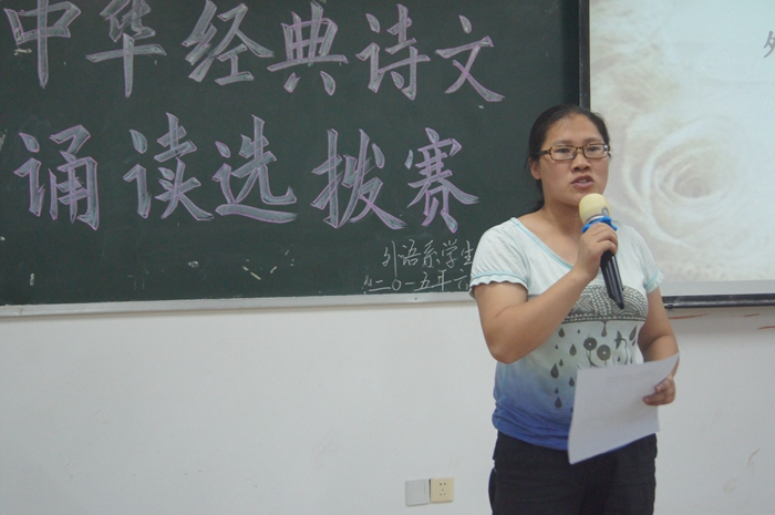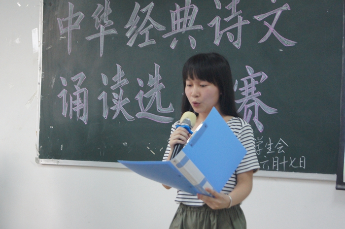 为了更好地响应学院语委2015年中华经典诗文诵读大赛,贯彻落实《国家通用语言文字法》,弘扬民族传统文化,推进中华经典活动的开展,同时给我院同学提供一个展现自我的平台。促进学生养成读书、诵读的良好习惯,提升学生审美情趣和文学艺术素养,营造和谐的人文校园氛围。外语系团学于2015年6月17日晚上19点在1505教室成功举办了2015年中华经典诗文诵读选拔大赛外语系初赛,外语系团学副书记周俊巧老师及外语系团学学生会副主席甘宏静担任本次比赛评委。