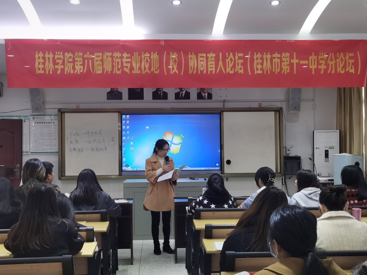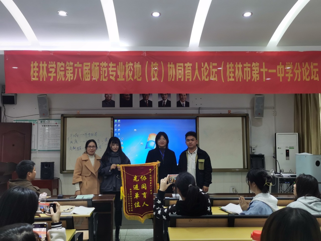 为了感谢和纪念桂林市第十一中学的领导和老师们对我院实习工作的大力支持,完善实习工作的机制,推进校地教育教学合作的良性发展,李丽群老师还代表我院给该校颁发了锦旗。