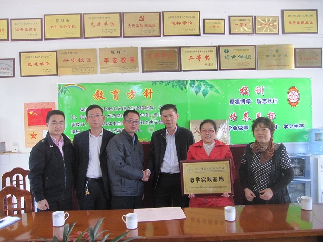 在挂牌仪式之前,十一中校领导与我院代表在会议室进行了座谈。在座谈会上,我院代表对桂林市十一中提供的实习机会和对实习学生的指导、关心、帮助表示衷心感谢。十一中校长对我院外语系实习生的表现予以了肯定,并表达了愿意长期合作、共同发展的意愿。在充分交流的基础上,双方在合作协议书上签字。签字仪式后,我院教育与科研管理处负责人同桂林市十一中校长共同为教学实践基地揭牌。