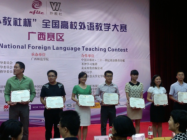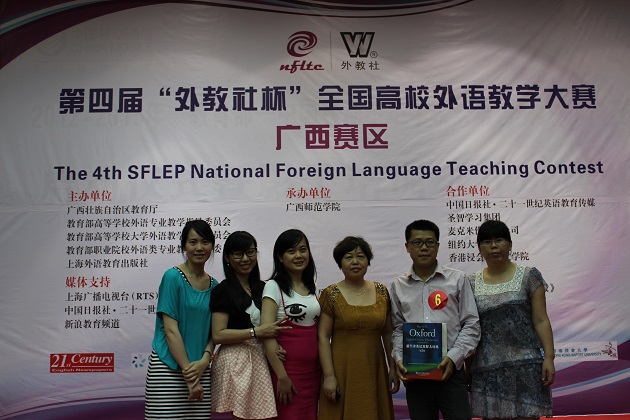 2013年“外教社杯”全国大学英语教学大赛广西赛区比赛于6月22-23日在广西师范学院举行。来自广西29所高校的综合组28名、听说组26名优秀大学英语教师汇集南宁,角逐广西高校外语教学最高奖项。经过紧张而激烈的比赛,我院外语系覃浩老师表现优异顺利进入决赛,获得三等奖,杨晓敏老师获得综合组优胜奖。