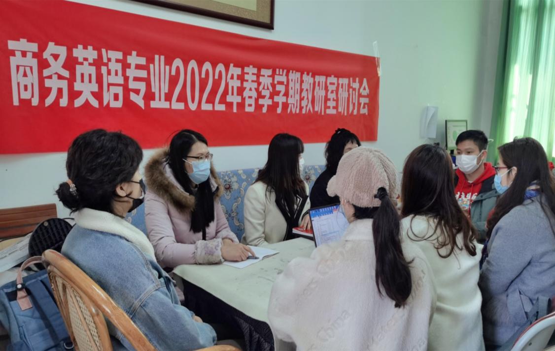 2月27日上午,语言文学学院商务英语专业2022年春季学期教研室研讨会在105办公室召开。会议由学院党总支书记江仿主持,商务英语教研室全体教师参加会议。