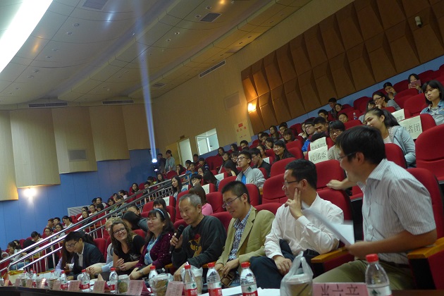 接下来,20位决赛选手依次上台用流利的英语进行自我介绍。本次比赛进行定题演讲和评委提问两个环节,参赛选手抽签依次上台演讲所抽到的题目,限时三分钟,;然后进入两分钟的评委提问环节。在演讲中,各参赛选手用流利的口语,良好的舞台表现赢得了现场观众的阵阵掌声。在提问环节,评委就选手在演讲中阐述的观点提出问题,选手作以回答。评委老师在互动中不时给决赛选手以鼓励和学习英语的建议,使选手们受到极大的鼓舞和启迪。