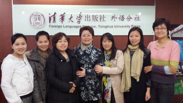 在清华大学出版社,郝建华社长亲自带领其骨干团队热情地了接待我们。在双方进行了简短的相互介绍后,我们参观了外语分社的办公场所和样书展示厅。清华大学出版社第一事业部主任刘细珍向我们介绍了清华大学出版社的发展历程和目前已出版的英语专业类、教师发展类、幼儿教育类等方面的教材和专著。然后,我们和出版社编辑就英语阅读、语音、写作等有关教材使用的问题、英语专业教材改革的要求、教师专业化发展、以及论文写作等方面的议题进行了深入的探讨和交流。外语分社的编辑还为我们赠送了最新的教材样书。