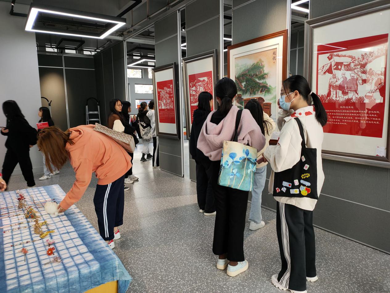 活动期间,同学们参观了“百年奋斗启新程,以史为鉴创未来”传统文化作品交流展,作品以石画、型糊染、刻纸等多种方式呈现,作品主题以党史、中国传统文化与桂林山水构成,每一幅作品的背后都是创作者的用心与坚持,体现着中华民族的文化自信以及对党、对民族、对国家的热爱。