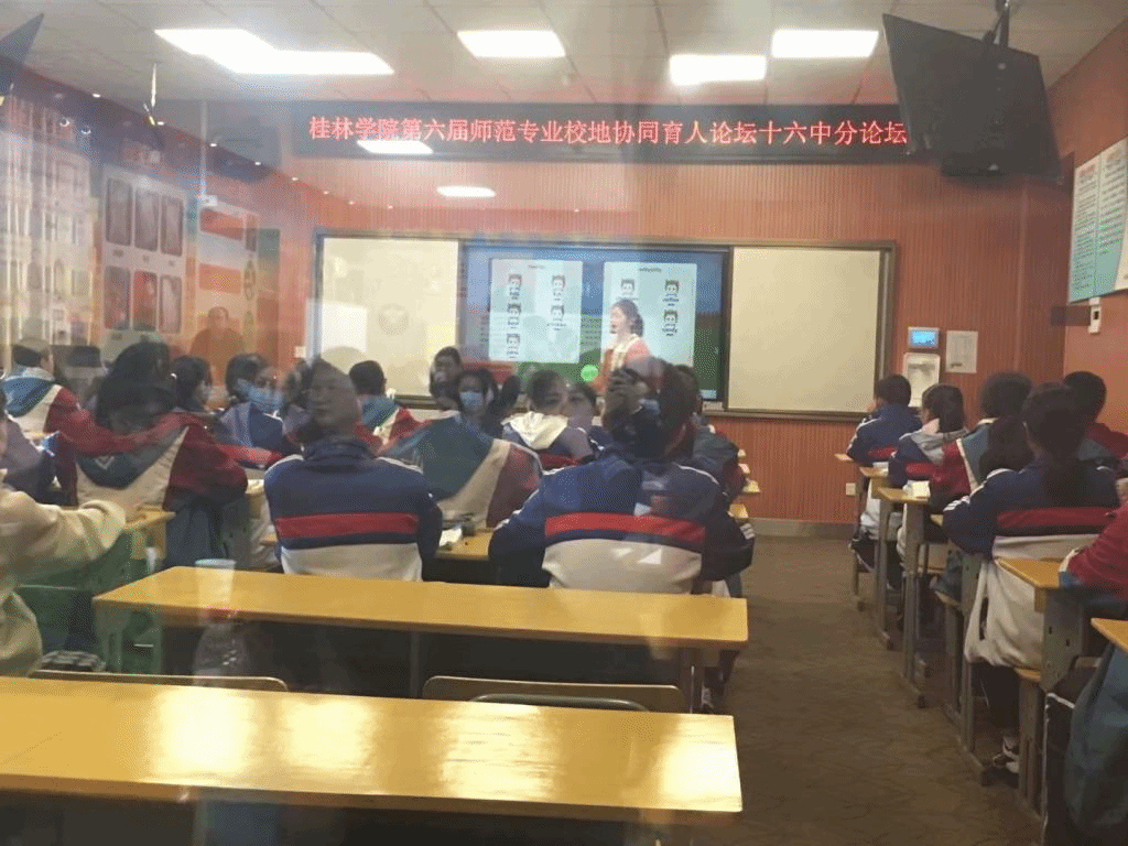 当日下午,恰逢第六届师范专业校地协同育人论坛十六中分论坛的召开。陆老师简要介绍了和实习基地桂林市第十六中学的合作情况,重点介绍了教育实习基地建设、教育实习统筹、教育实习管理等方面。随后,柳州工学院代表团老师进入录播室,共同参与了十六中分论坛的同课异构活动。
