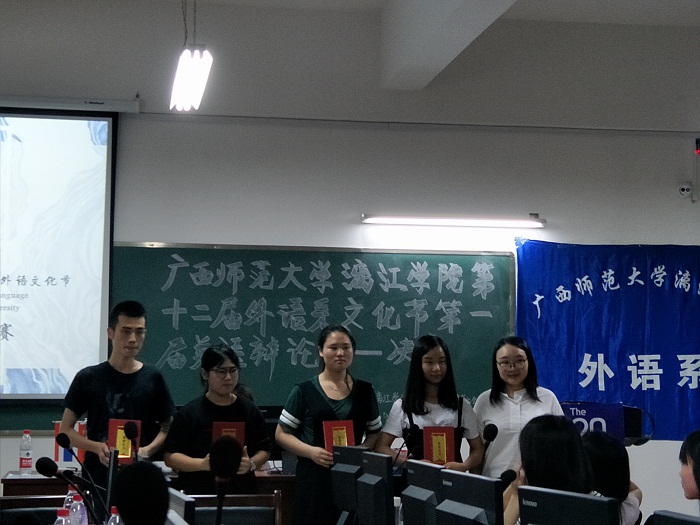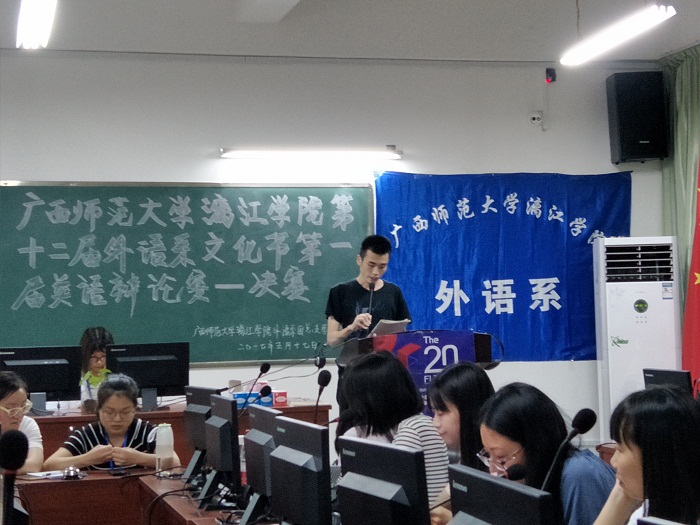 5月17日晚,由漓江学院外语系主办,大学外语第二教研室、学生会学习部承办的外语系文化节之第一届英语辩论比赛在3411同声传译室圆满落幕。漓江学院英语辩论全体队员、2016级英语专业学生代表现场观摩,漓江学院电视台进行了全程拍摄报道。