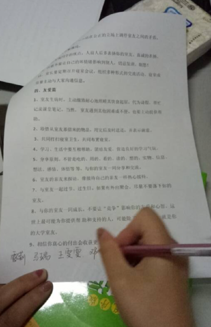 寝室是大学生学习、生活的重要组成部分之一,也是建立和谐的人际关系的基础,更是当代大学生素质的体现。拥有一个和谐、良好、文明的寝室氛围,是大学生学习、生活的保障。为了营造一个良好的学习氛围,加强学风建设,外语系学生第二党支部以榕湖家苑212寝室学生党员工作站为平台,宣传号召该年级所有同学加入大学生寝室文明公约活动。该活动主要围绕宿舍成员间沟通技巧、和谐相处,化解矛盾等几块女生公寓常见问题展开宣传,引起了同学们的热议。活动前期,工作站通过向全体同学收集意见整理完善寝室文明公约,在得出规范的公约后,212学生党员工作站所有成员积极认真对每个宿舍进行宣传,走进宿舍,帮助与各位同学了解、学习寝室文明公约。