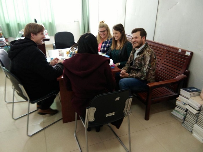 2017年2月26日,为加强外教管理,推进高校转型发展,我校外语系召开2016-2017学年第二学期外籍教师见面会,外语系何玲主任、张超锋副主任,大外教研室主任黄文敏老师、覃浩老师参加会议。会议由何玲主任主持。见面会就我校教师守则、本学期外教教师开设课程与教学管理相关事宜进行说明与阐释。